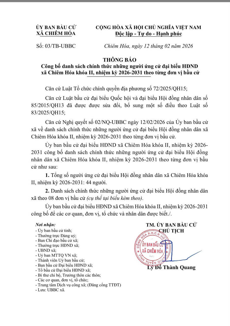 Thông báo số Số: 03/TB-UBBC ngày 15/02/2026 của UBND xã